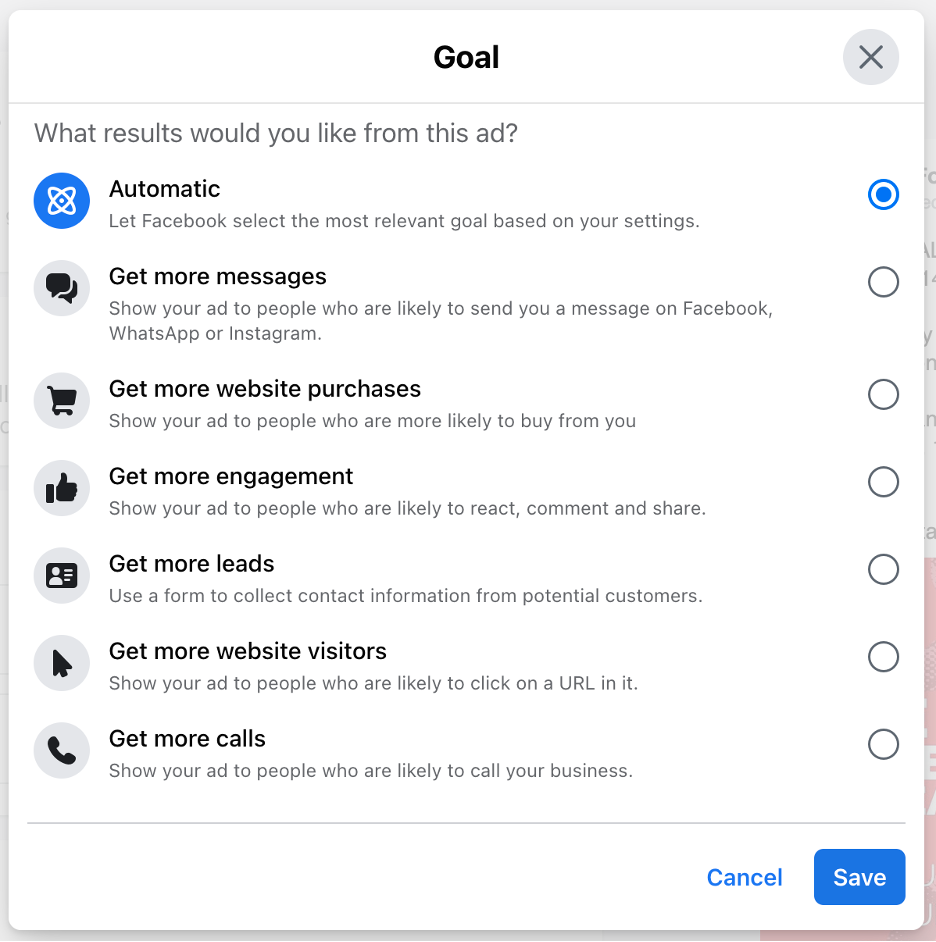While creating an advert through the main Facebook Ads Manager tool allows you to pick from several ad objectives, the boost function is a little more limited.