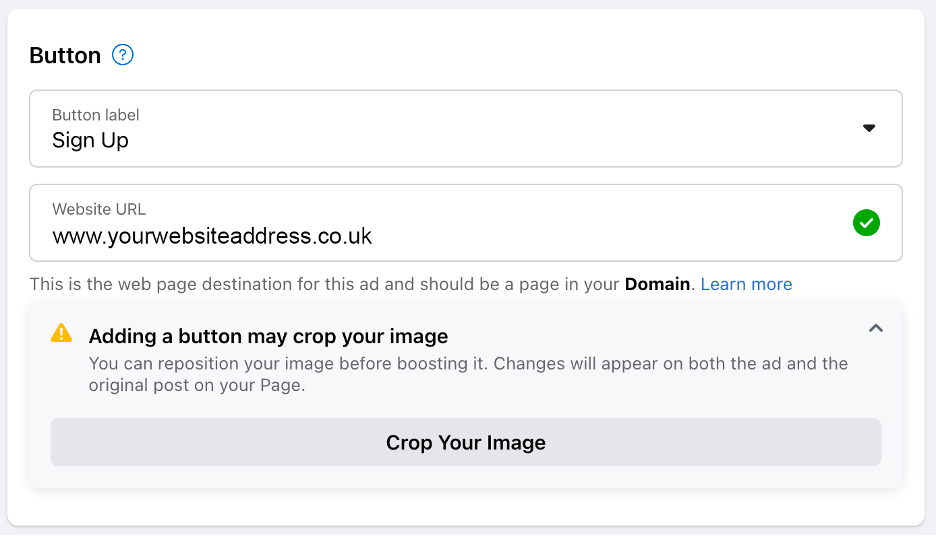 For the button label – the wording prompt that people will see on the button on your post – you can select from five different options, including Sign Up, Learn More, or Book Now.