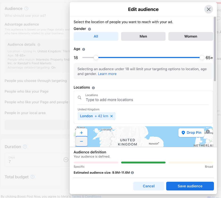 Once you have gone through and added the details relevant to you and your advert, you will see ‘Audience Definition’, which will rank your audience from Specific (your ad could go to fewer people, but will be very close to your targeting settings) through to Broad (your ad might be able to reach a wider group of people, but might not have a direct connection to your interest), and ‘Estimated Audience Size’, which will give a rough figure of the number of people who could potentially see your advert.