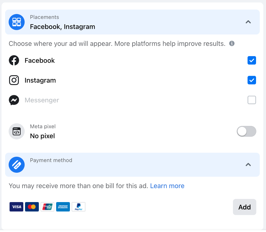 In the Facebook app, you are limited to running your posted post on Facebook and Instagram, while the pixel will be automatically selected if you have one connected to your chosen Ad Account, which you can select here.